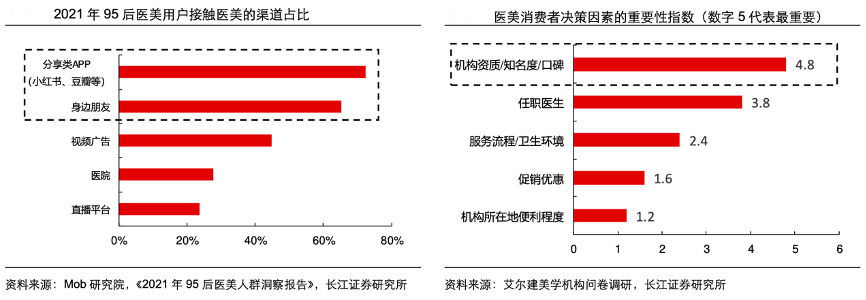 經(jīng)典案例:根據(jù)Mob研究院、《2021年95年醫(yī)美人群洞察報(bào)告》、艾爾建美學(xué)機(jī)構(gòu)問(wèn)卷調(diào)研、長(zhǎng)江證券研究所等綜合資訊表明,2021年 11 月市場(chǎng)監(jiān)管總局頒布的《醫(yī)療美容廣告 執(zhí)法指南》旨在重點(diǎn)打擊“醫(yī)美形象代言人”、制造“容貌焦慮”以及變相宣傳,嚴(yán)格規(guī)范了醫(yī)美宣傳渠道,消費(fèi)者獲知醫(yī)美的信息渠道逐步從夸大失實(shí)的廣告轉(zhuǎn)向小紅書等相對(duì)客觀的分享類 APP 和親友間交流,此外醫(yī)美項(xiàng)目的高試錯(cuò)成本進(jìn)一步加大了新客對(duì)其他求美者經(jīng)驗(yàn)的關(guān)注,因而更加傾向于根據(jù)機(jī)構(gòu)口碑來(lái)做出謹(jǐn)慎、理性的消費(fèi)決策。