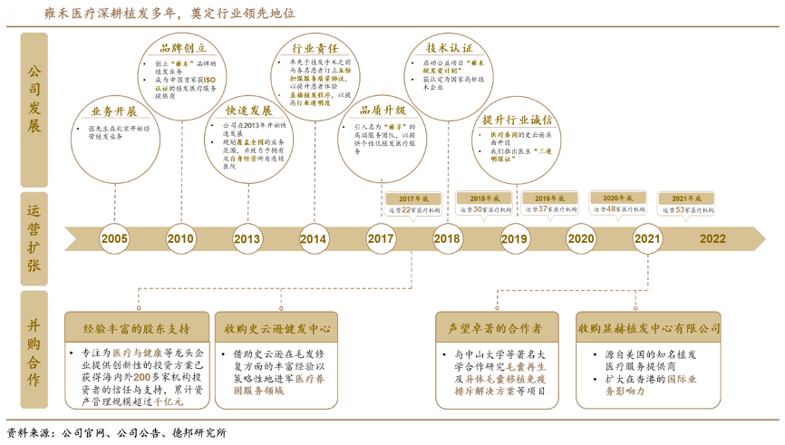 經(jīng)典案例:根據(jù)公司官網(wǎng)、公司公告、德邦研究所等綜合資訊表明,雍禾醫(yī)療雍禾醫(yī)療深耕植發(fā)多年,奠定行業(yè)領(lǐng)先地位。憑借雍禾的醫(yī)療服務(wù)能力及史云 遜養(yǎng)發(fā)經(jīng)驗(yàn),公司拓展療養(yǎng)固服務(wù)領(lǐng)域,以“店中店”模式設(shè)立史云遜健發(fā)中心,并于 2021 年 5 月收購顯赫植發(fā)的香港業(yè)務(wù),同時(shí)公司與中山大學(xué)等機(jī)構(gòu)合作研發(fā),增強(qiáng)核心競爭力。