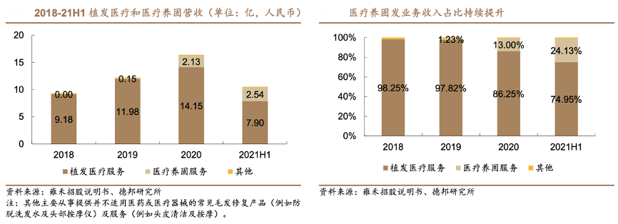 經(jīng)典案例:根據(jù)雍禾醫(yī)療招股書、德邦研究所等綜合資訊表明,毛發(fā)醫(yī)療服務(wù)市場(chǎng) 分為植發(fā)醫(yī)療服務(wù)市場(chǎng)和醫(yī)療養(yǎng)固服務(wù)市場(chǎng),雍禾醫(yī)療公司于 2017 年收購史云遜健發(fā)中心,開始布局醫(yī)療養(yǎng)固服務(wù)市場(chǎng),2018 年開始在植發(fā)機(jī)構(gòu)中建立“館中館”史云遜建發(fā)中心,提供醫(yī)療養(yǎng)固服務(wù)。雍禾主營業(yè)務(wù)仍舊是植發(fā)醫(yī)療服務(wù),但醫(yī)療養(yǎng)固 服務(wù)營業(yè)收入占比呈現(xiàn)上升趨勢(shì),2019 年雍禾醫(yī)療的植發(fā)醫(yī)療服務(wù)和醫(yī)療養(yǎng)固服務(wù)營業(yè)收入分別為 11.98 億元和1,500 萬元人民幣。