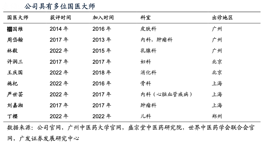 經(jīng)典案例:根據(jù)公司官網(wǎng)、廣州中醫(yī)藥大學(xué)官網(wǎng)、盛宗堂中醫(yī)藥研究院、世界中醫(yī)藥學(xué)會(huì)聯(lián)合會(huì)官網(wǎng)、廣發(fā)證券發(fā)展研究中心等綜合資訊表明,“中醫(yī)看人”,多位國(guó)醫(yī)大師、國(guó)家級(jí)和省市級(jí)名中醫(yī)坐鎮(zhèn)固生堂,為集團(tuán)提供可 靠背書,樹立品牌打響知名度。截至2022年12月31日,固生堂在全國(guó)共擁有9名多點(diǎn)執(zhí)業(yè)的國(guó)醫(yī)大師, 數(shù)量排名第一。