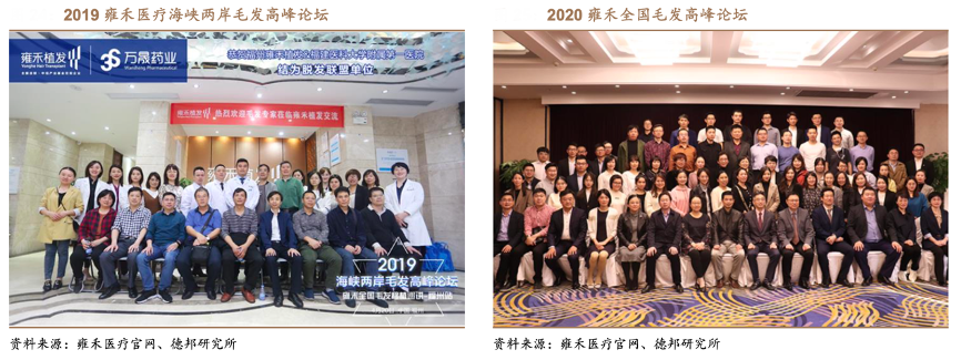 經(jīng)典案例:根據(jù)雍禾醫(yī)療官網(wǎng)、德邦研究所等綜合資訊表明,雍禾醫(yī)療公司 2020 年在鄭州與杭州舉辦雍禾醫(yī)療毛發(fā)高峰論壇。2019 年雍禾醫(yī)療與萬晟藥業(yè)聯(lián)合主辦的全國毛發(fā)主題巡講,聚集國際頂尖植發(fā)專家與國內(nèi)行業(yè)精英代表進(jìn)行巔峰對話,深度探討植發(fā)行業(yè)發(fā)展趨勢和技術(shù)創(chuàng)新未來發(fā)展。