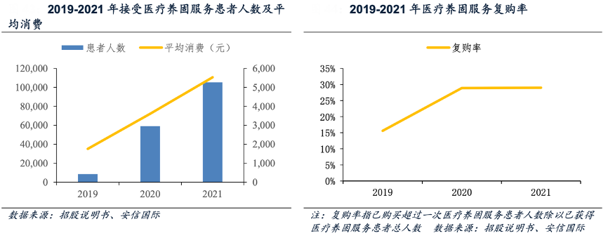 經(jīng)典案例:根據(jù)招股說明書、安信國際等綜合資訊表明,雍禾醫(yī)療公司收購英國健發(fā)品牌史云遜后開始進(jìn)軍醫(yī)療養(yǎng)固業(yè)務(wù),經(jīng)過多年的發(fā)展,協(xié)同效應(yīng)成效顯現(xiàn),2021 年植發(fā)患者手術(shù)后選擇進(jìn)行醫(yī)療養(yǎng)固服務(wù)的轉(zhuǎn)化率為44.6%,醫(yī)療養(yǎng)固服務(wù)后繼續(xù)選擇植發(fā)手術(shù)的轉(zhuǎn)化率為4.1%。因醫(yī)療養(yǎng)固服務(wù)非手術(shù)且更易負(fù)擔(dān),受到越來越多消費者的青睞,接受醫(yī)療養(yǎng)固服務(wù)的患者人數(shù)、人均消費、復(fù)購率不斷攀升,其中,復(fù)購率從 2019 年的 15.6%增長至 2021 年的 29.0%,說明消費者粘性不斷提高。