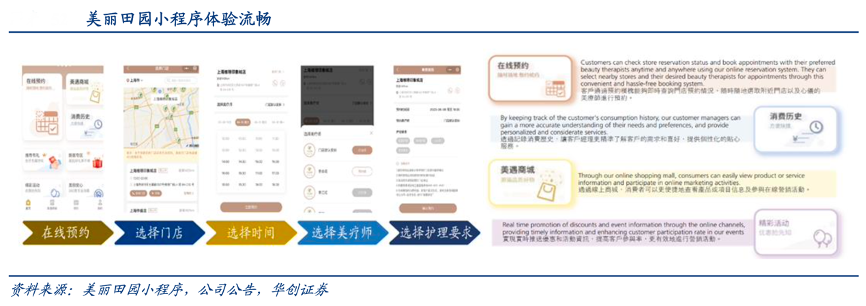經(jīng)典案例:根據(jù)公司公告、美麗田園小程序、華創(chuàng)證券等綜合資訊表明,美麗田園當(dāng)前公司數(shù)據(jù)平臺(tái)涉及區(qū)域發(fā)展模型、門(mén)店運(yùn)營(yíng)支持模型、 客戶(hù)分析模型、員工發(fā)展模型,其中客戶(hù)關(guān)系管理系統(tǒng)中涵蓋 96 項(xiàng)客戶(hù)標(biāo)簽,用戶(hù)畫(huà)像 完整,利于挖掘客戶(hù)需求(如生美和醫(yī)美相互賦能)和喚醒沉睡客戶(hù)。2020 年初公司上線“美田在線”小程序,涵蓋線上預(yù)約、信息發(fā)布、營(yíng)銷(xiāo)活 動(dòng)、直播體驗(yàn)、線上商城、服務(wù)回訪等,實(shí)現(xiàn)從預(yù)約→消費(fèi)→服務(wù)反饋的閉環(huán)。