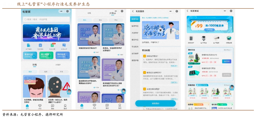 經(jīng)典案例:根據(jù)毛管家小程序、德邦研究所等綜合資訊表明,雍禾醫(yī)療公司積極推進(jìn)在線(xiàn)醫(yī)療服務(wù),已建立一支在線(xiàn)醫(yī)療團(tuán)隊(duì),在微信小程序上開(kāi)發(fā)“毛管家”小程序,擁有超 81 萬(wàn)名注冊(cè)用戶(hù),可為患者進(jìn)行植發(fā)手術(shù)介紹、查詢(xún)醫(yī)生執(zhí)照及價(jià)格信息等,可實(shí)時(shí)上傳患者病歷等文件,從而提供便捷專(zhuān)業(yè)的在線(xiàn)咨詢(xún)、術(shù)后復(fù)查服務(wù)。