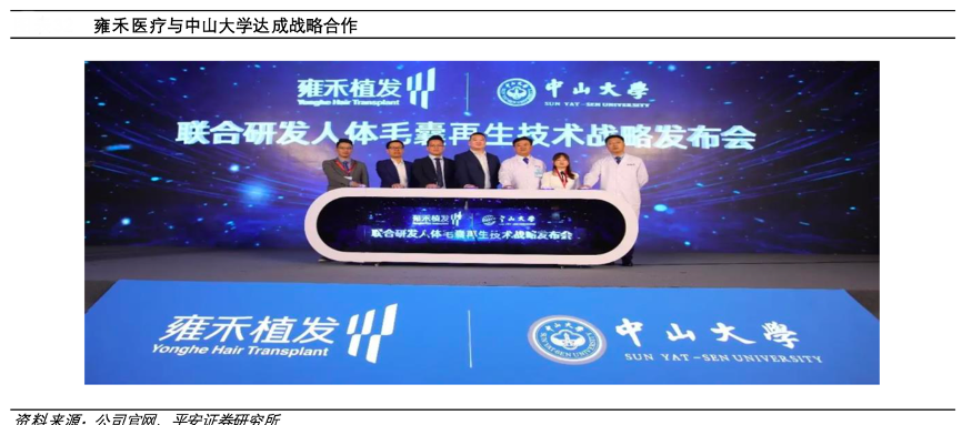 經(jīng)典案例:根據(jù)公司官網(wǎng)、平安證券研究所等綜合資訊表明,雍禾醫(yī)療與中山大學(xué)達(dá)成戰(zhàn)略合作,研究異體毛囊移植免疫排斥解決方案、新型預(yù)防焦慮誘導(dǎo)脫髮的小分子藥物開(kāi)發(fā)、多功能型植髮手術(shù)床、溫和型泡沫洗髮水等,并初步取得成果。2021年,公司與四川大學(xué)華西醫(yī)院合作雄脫治療新靶點(diǎn)項(xiàng)目,進(jìn)一步在防脫植發(fā)領(lǐng)域深耕。