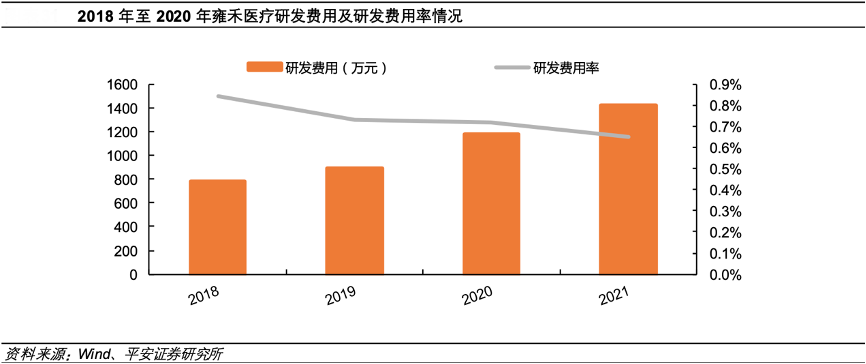 經(jīng)典案例:根據(jù)wind、天安證券研究所等綜合資訊表明,雍禾醫(yī)療公司的 LATTICE 點(diǎn)陣加密技術(shù),是針對天生頭發(fā)稀疏,發(fā)質(zhì)細(xì)軟,因脫發(fā)導(dǎo)致頭頂頭發(fā)稀疏等情況研發(fā)出的植發(fā)技術(shù),做到對原有頭發(fā)的“0”損傷。2018 年至 2021 年,公司的研發(fā)費(fèi)用(781/887/1181/1416 萬元)不斷增加,研發(fā)費(fèi)用率 ( 0. 84% / 0. 73%/ 0.72% /0. 65%)略有下滑穩(wěn)定。