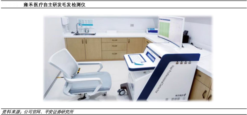 經(jīng)典案例:根據(jù)公司官網(wǎng)、平安證券研究所等綜合資訊表明,雍禾醫(yī)療公司自主研發(fā)了毛發(fā)檢測儀,可以精確測量毛發(fā)的長度和直徑,準(zhǔn)確分析脫發(fā)程度,并 協(xié)助醫(yī)生制定診斷治療方案,通過智能圖像識別及大數(shù)據(jù)演算以提升患者就診體驗(yàn)。公司攻關(guān)研發(fā)了專業(yè)植發(fā)多功能手術(shù)床, 自主設(shè)計(jì)研發(fā)手術(shù)醫(yī)療輔助器械,同時(shí)還采用了PK7000 毛囊提取儀、SKIN 管理儀、光動(dòng)力儀等。