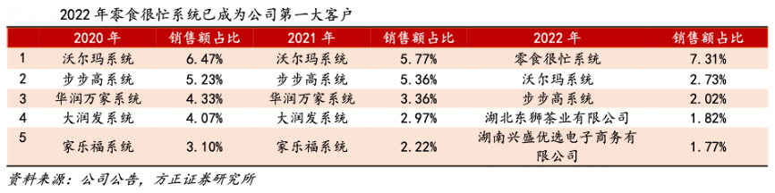 經(jīng)典案例:根據(jù)公司公告、方正證券研究所等綜合資訊表明,鹽津鋪?zhàn)庸韭氏炔季至闶硨I(yíng)系統(tǒng),目前已與頭部品牌建立合作關(guān)系。公司于 2021 年與零食很忙達(dá)成合作,成為率先布局零食專營(yíng)系統(tǒng)的上市公司品牌之一。目前公司在零食很忙的 SKU 已逐步拓展至約 40 多個(gè),涵蓋多個(gè)核心品類,并不斷上新品。2022 年,零食很忙已超越超越沃爾瑪成為公司第一大客戶,公司的報(bào)表端在零食很忙實(shí)現(xiàn) 2.11 億元的銷售額。