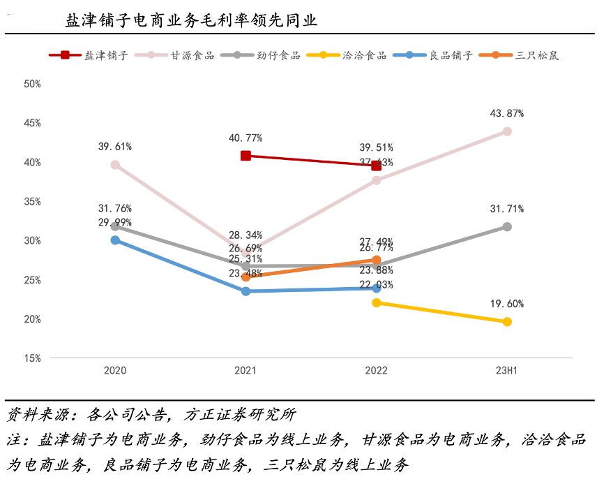 經(jīng)典案例:根據(jù)各公司公告、方正證券研究所等綜合資訊表明,鹽津鋪?zhàn)?nbsp;95%的產(chǎn)品均為自研自產(chǎn),通過(guò)長(zhǎng)期生產(chǎn)經(jīng)驗(yàn)的不斷積累,積極引進(jìn)數(shù)字化賦能生產(chǎn),公司在供應(yīng)鏈方面具備核心優(yōu)勢(shì),面臨線上平臺(tái)的激烈競(jìng)爭(zhēng),公司仍能保持較高的毛利率水平。2021/2022 年公司電商業(yè)務(wù)毛利率分別為 40.77%和 39.51%,在行業(yè)中處于領(lǐng)先地位。