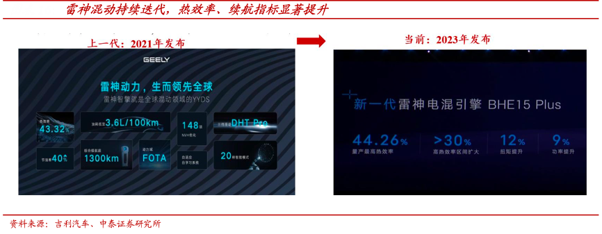 經(jīng)典案例:根據(jù)吉利汽車(chē)、中泰證券研究所等綜合資訊表明,以銀河 L7 為例,其在搭載 1.5T 雷神電混 8848 系統(tǒng)并配備 P1+P2 雙電機(jī),最低荷 電油耗為百公里 5.23L,CLTC 綜合續(xù)航則達(dá)到 1370km。