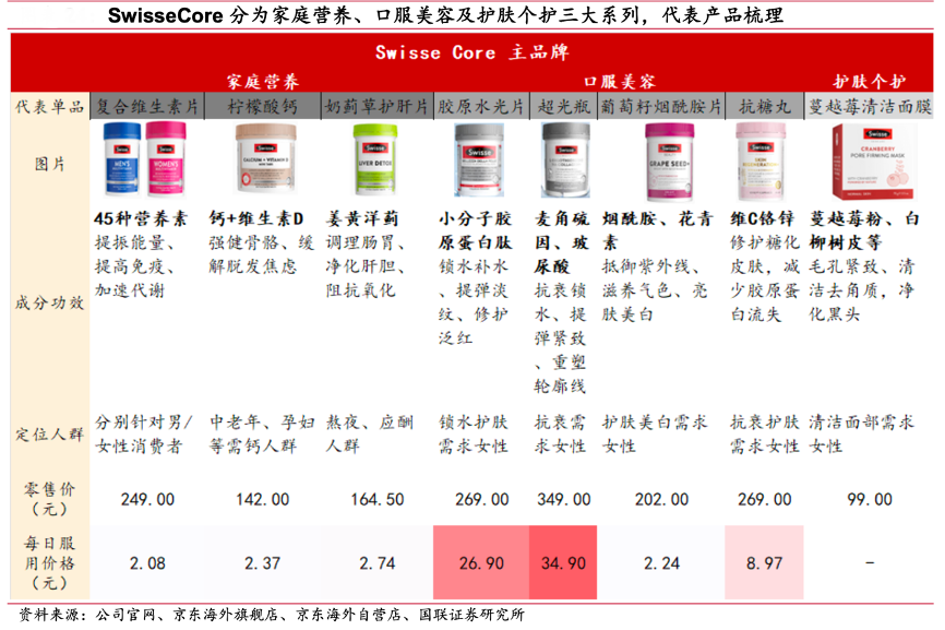 經(jīng)典案例:根據(jù)公司官網(wǎng)、京東海外旗艦店、京東海外自營店、國聯(lián)證券研究所等綜合資訊表明,Swisse Core 分為家庭營養(yǎng)、口服美容及護膚個護三大系列,品牌內(nèi)部新老迭代明確。公司從家庭營養(yǎng)系列的膳食營養(yǎng)補充劑出發(fā),向口服美容方向如膠原水光片、超光瓶、美白丸及抗糖丸等產(chǎn)品以及護膚個護類面膜、磨砂膏及卸妝膏等新品類延展。