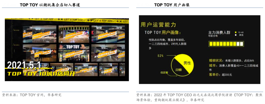 經(jīng)典案例:根據(jù)TOP TOY官網(wǎng)、2022年TOP TOY CEO孫元文在混沌商學(xué)院演講《TOP TOY:聚集場景體驗,重構(gòu)潮玩商業(yè)模式》、華泰研究等綜合資訊表明,聚焦 10-40 歲的消費群體,TOP TOY 為其提供 9 大品類,盲盒、手辦、娃娃、合 金、大眾玩具、積木、拼裝、雕像以及原創(chuàng)產(chǎn)品。截至 2023 年 6 月 30 日,TOP TOY 提 供約 7,000 個 SKU。