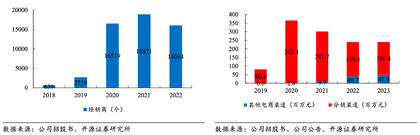 經(jīng)典案例:根據(jù)公司招股書、公司公告、開源證券研究所等綜合資訊表明,巨星傳奇公司通過 IP 賦能私域流量轉(zhuǎn)化,推動消費者向分銷商及 KOC 裂變。公司借助昆山汀奢分銷產(chǎn)品的分銷代理向相關(guān)經(jīng)銷商提供在線銷售和營銷方面的輔助及培訓(xùn),由此建立有效的分銷網(wǎng)絡(luò),2022年公司在全國擁有超過 16000 個經(jīng)銷商。