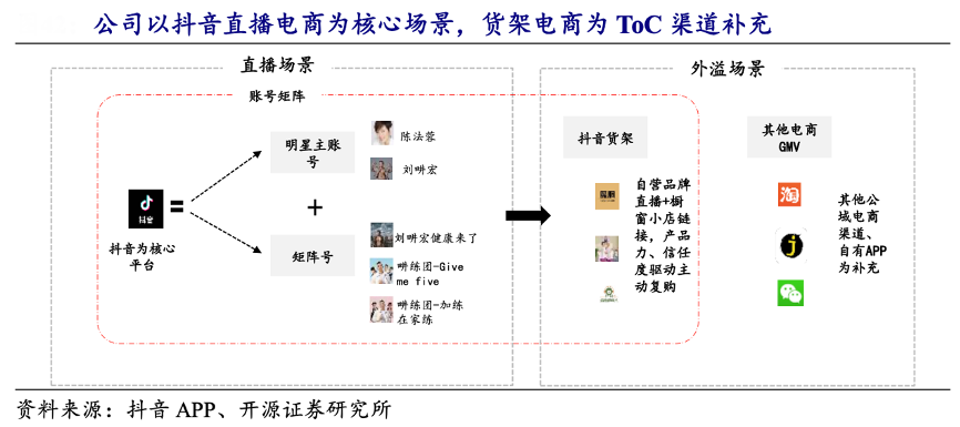 經(jīng)典案例:根據(jù)抖音APP、開源證券研究所等綜合資訊表明,巨星傳奇公司通過自有明星 IP 劉畊宏、陳法蓉抖音矩陣號直播帶貨為核心場景,抖音貨架&自有 APP、其他電商渠道承接外溢復(fù)購需求,積極招募和培育外部 KOL(部分 KOC 通過運營社交平臺賬號,有潛力成為腰尾部 KOL)參與品牌公域推廣。2023 年公司通過直播和貨架電商渠道銷售自有品牌金額為 4940 萬元,同比增長 21.4%,占比提升至 21%。