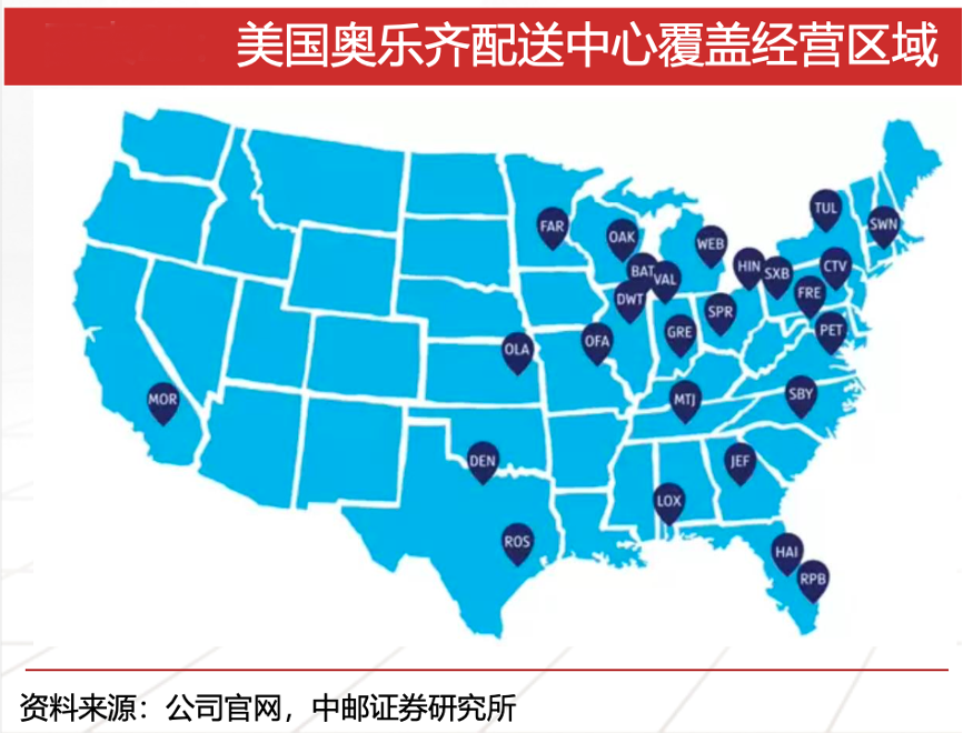經(jīng)典案例:根據(jù)公司官網(wǎng)、中郵證券研究所等綜合資訊表明,以美國(guó)奧樂(lè)齊為例,根據(jù)公司官網(wǎng)奧樂(lè)齊在美國(guó)建立22個(gè)配送中心,基本每個(gè)超市所在州均有配送中心。短鏈配送體系使快速的商品周轉(zhuǎn)成為可能,降低公司庫(kù)存成本。