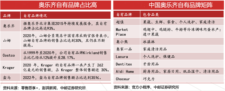 經(jīng)典案例:根據(jù)零售思享+、澎湃新聞、官方小程序、中郵證券研究所等綜合資訊表明,異于一般商超20%-30%的自有品牌率,奧樂(lè)齊自有品牌占比高達(dá)93%。以中國(guó)奧樂(lè)齊為例,目前中國(guó)奧樂(lè)齊主打“超值”品牌系列,伴隨奧小熊、奧家一品等細(xì)分品類自有品牌,共同構(gòu)成了中國(guó)奧樂(lè)齊“低 價(jià)+高性價(jià)比”的自有品牌矩陣。