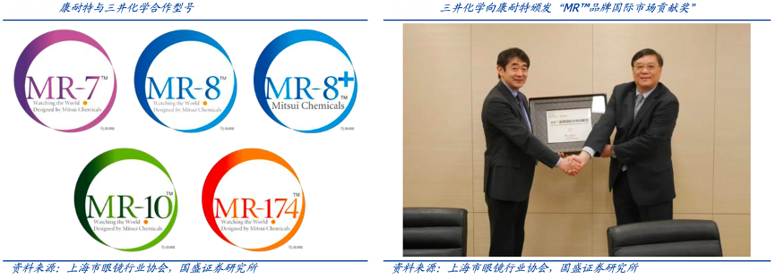 經(jīng)典案例:根據(jù)上海市眼鏡行業(yè)協(xié)會、國盛證券研究所等綜合資訊表明,MRTM系列材料方面,康耐特是日本三井化學(xué)最重要的戰(zhàn)略合作伙伴之一。三井化學(xué)曾向康耐特頒發(fā)“MRTM品牌國際市場貢獻獎”,康耐特憑借其在 MRTM產(chǎn)品推廣方面的積極貢獻,獲得鏡片原料領(lǐng)域全球龍頭三井化學(xué)的高度認可。