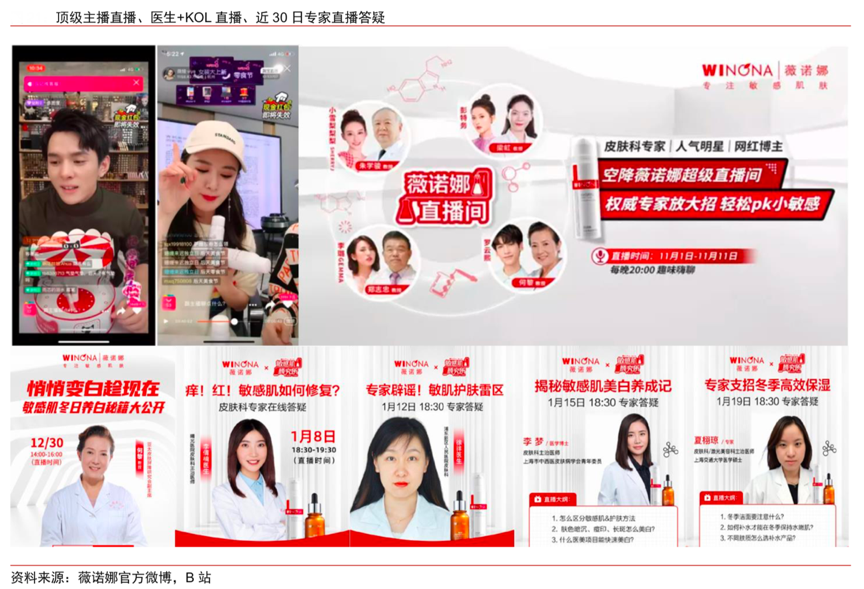 經(jīng)典案例:根據(jù)薇諾娜官方微博、B站、中信證券研究部等綜合資訊表明,薇諾娜品牌直播形式多樣,“醫(yī)生+KOL”直播推進消費者教育。2019 年雙 11 期間,李佳琦直播間,10 秒賣出 2.5 萬套舒敏保濕特護霜旋轉木馬禮盒,10 秒售出 5 萬支清透防曬乳。薇婭當天售出 1.7 萬瓶青刺果修護保濕噴霧。同時薇諾娜還在日常設置了專家直播答疑活動,頻率約為每周一次,對消費者進行護膚和敏感肌教育。