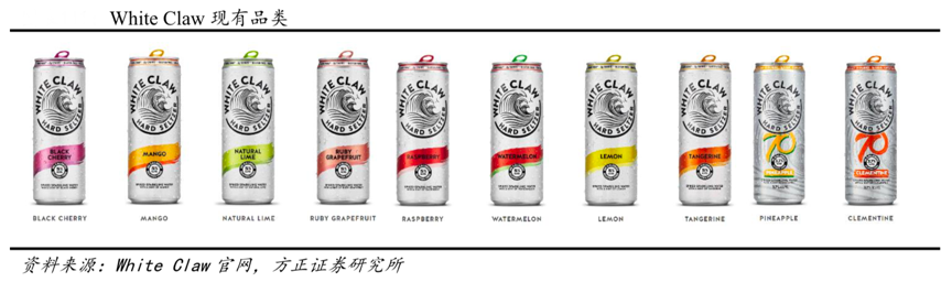 經(jīng)典案例:根據(jù)White Claw官網(wǎng)、方正證券研究所等綜合資訊表明,White Claw 采用的“純粹釀造法”(BrewPure),并注冊(cè)專利。“純粹釀造法”運(yùn)用純天然成分,不含谷物,所釀酒口感較普通麥芽飲料更清新自然,與水果風(fēng)味更易 融合??谖斗矫嬗勺铋_始的三種口味天然酸橙、黑櫻桃、紅寶石葡萄柚拓展至 10 種,盡管推新速度較慢,但持續(xù)推進(jìn)品種豐富度,基本覆蓋最受消費(fèi)者歡迎的硬蘇打水口味。