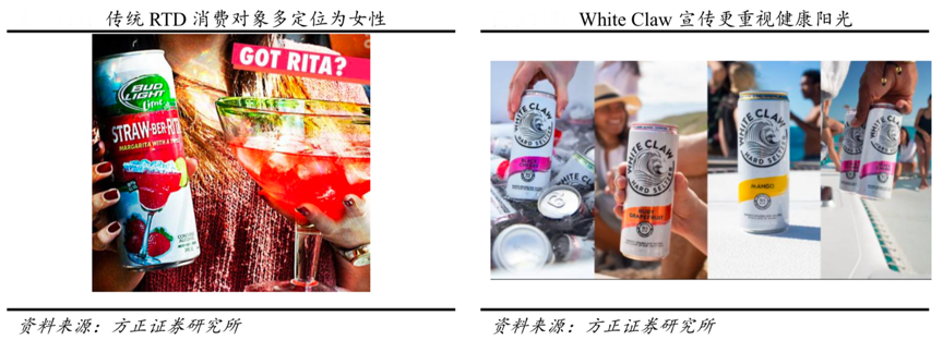 經(jīng)典案例:根據(jù)White Claw官網(wǎng)、方正證券研究所等綜合資訊表明,White Claw 的流行主要抓住了美國(guó)年輕人兩大消費(fèi)潮流:健康意識(shí)和性別包容意識(shí)。年輕消費(fèi)群體的健康意識(shí)和身材管理意識(shí)增強(qiáng),傳統(tǒng)麥芽釀造的啤酒熱量、酒精度較高,而White Claw 主打的酒精度數(shù) 低(為 5%)、低卡(一瓶 100 大卡)、低碳水化合物(僅 2 克)、無麩質(zhì)等特點(diǎn)均精準(zhǔn)切合目標(biāo)客戶需求。White Claw 中性化的瓶身外觀在設(shè)計(jì)上也模糊了男女消費(fèi)者之間的性別界限。