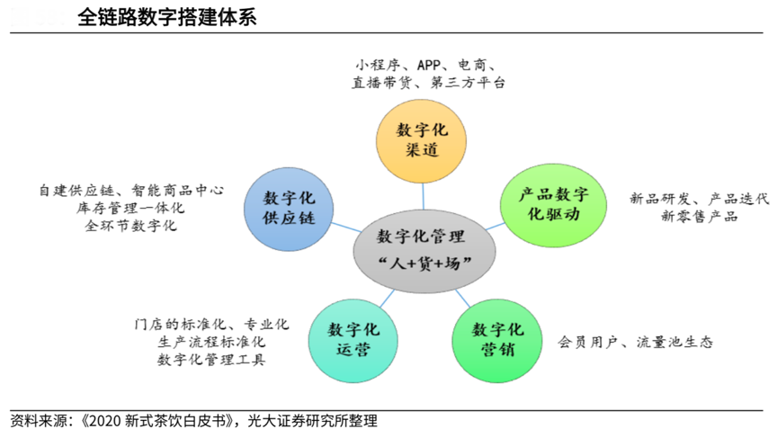經(jīng)典案例:根據(jù)《2020 新式茶飲白皮書》、光大證券研究所等綜合資訊表明,新式茶飲已進入 3.0 數(shù)字化階段,新式茶飲企業(yè)開始數(shù)字化轉(zhuǎn)型,例如入駐電商平臺、上線小程序拼單、大數(shù)據(jù)選址等數(shù)字化運營,奈雪的茶擁有強大的信息處理平臺 Teacore。在每間茶飲店中,奈雪的茶均部署了自研的集成信息平臺 Teacore,可處理大量的運營數(shù)據(jù),能夠集合線上及線下交易信息。