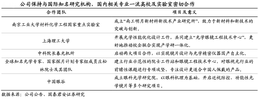 經(jīng)典案例:根據(jù)公司公告、國泰君安證券研究等綜合資訊表明,明月鏡片公司重視技術(shù)及產(chǎn)品的研發(fā),設(shè)立研發(fā)中心并制定一套完整的研發(fā)業(yè)務(wù)流程及科研項(xiàng)目管理流程,組建一支技術(shù)水平過硬、行業(yè)經(jīng)驗(yàn)豐富的技術(shù)研發(fā)團(tuán)隊(duì)。為研發(fā)更符合中國人眼球結(jié)構(gòu)和用眼習(xí)慣的產(chǎn)品,公司長期保持與國際知名研究機(jī)構(gòu)、國內(nèi)相關(guān)專業(yè)一流高校及實(shí)驗(yàn)室密切合作。
