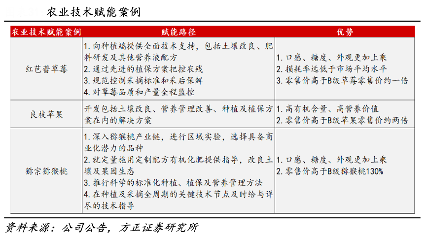 經(jīng)典案例:根據(jù)公司公告、方正證券研究所等綜合資訊表明,百果園通過向合作的種植基地推廣種植理念和種植與采后技術(shù),幫助種植基地培育優(yōu)質(zhì)果品,提升產(chǎn)量。