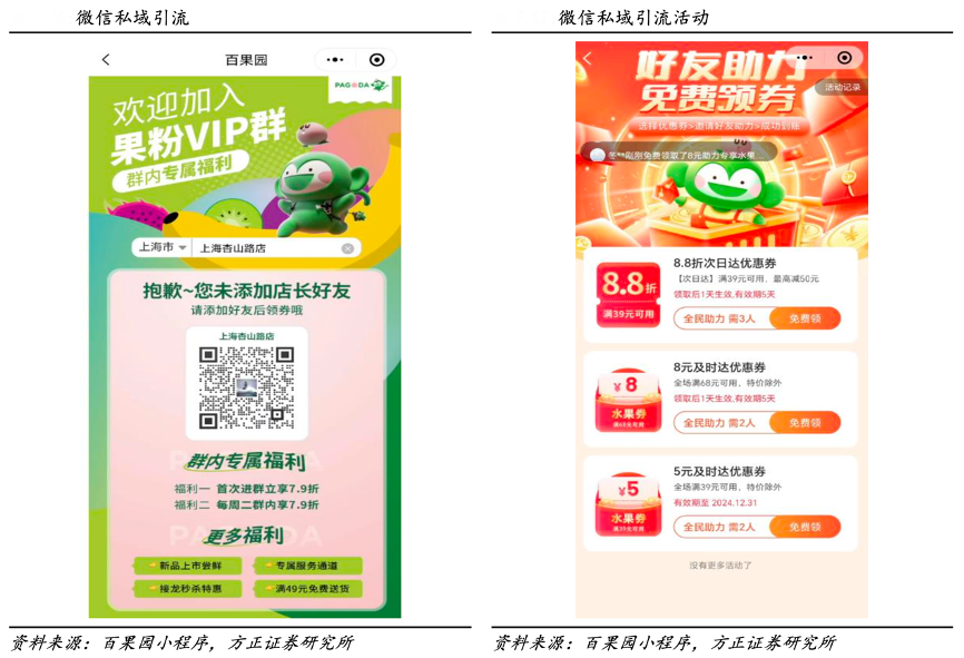 經(jīng)典案例:根據(jù)百果園小程序、方正證券研究所等綜合資訊表明,百果園推出了“到店自提”的運營模式以實現(xiàn)線上線下的流量循環(huán)。用戶從 各個觸點接觸到“到店自提”的優(yōu)惠活動,并下單購買。在用戶到店后,門店工作人員會主動拋出“買水果送回頭券”、“99 元入會”、“進群搶福利”等優(yōu)惠活動,引導(dǎo)用戶添加企微好友。最后,引導(dǎo)用戶進群,進行欄目化、精細化管理,讓用戶能夠第一時間了解最新產(chǎn)品優(yōu)惠,促使用戶決策、購買。