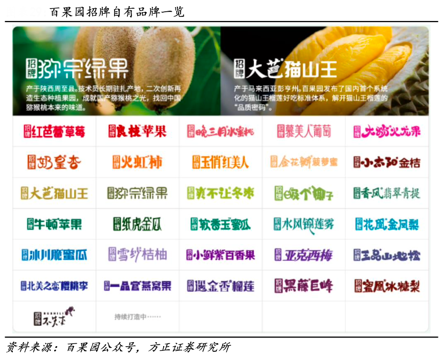 經(jīng)典案例:根據(jù)百果園公眾號(hào)、方正證券研究所等綜合資訊表明,截止 2023H1,百果園公司共推出 35 個(gè)自有產(chǎn)品品 牌,零售額同比增長 27%。相比 2022 年同期,自有品牌的零售額占百果園門店零 售總額達(dá)到12%,2023 年提升至 14%。招牌果及自有品牌水果平均每月購買率一 般高于 B 級(jí)水果 50%。