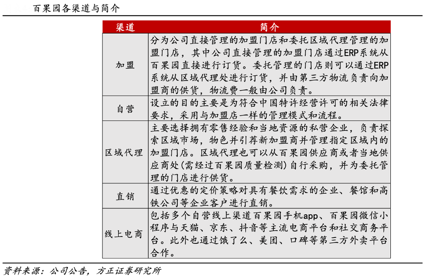 經(jīng)典案例:根據(jù)公司公告、方正證券研究所等綜合資訊表明,百果園主要通過門店加盟業(yè)務擴張,同時部署“線上做寬線下做專”的業(yè)務模式。通過區(qū)域代理快速探索區(qū)域市場,占領市場份額。