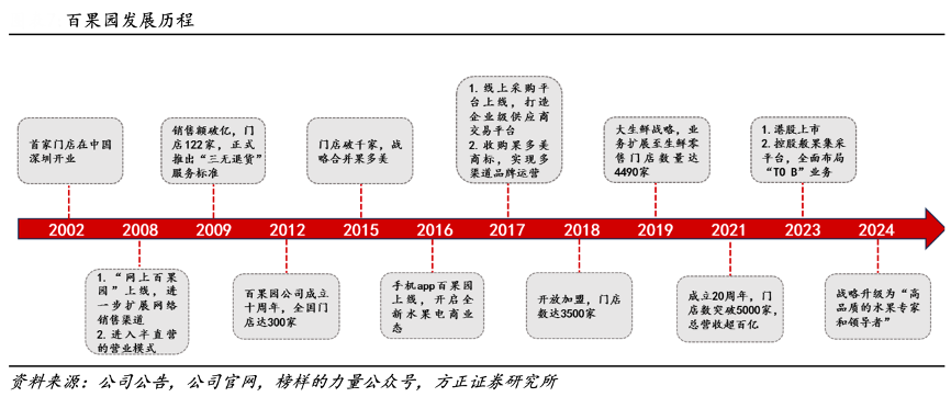 經(jīng)典案例:根據(jù)公司公告、公司官網(wǎng)、榜樣的力量公眾號、方正證券研究所等綜合資訊表明,百果園業(yè)務(wù)多元化發(fā)展,品牌戰(zhàn)略升級。2019 年發(fā)布“大生鮮” 戰(zhàn)略,2020年推出“熊貓大鮮”布局生鮮市場。2023 年公司于港股上市,并控股般果平臺,全面布局“To B”業(yè)務(wù)。2024 年品牌戰(zhàn)略升級為“高品質(zhì)的水果專家和領(lǐng)導(dǎo)者”,計劃十年內(nèi)營收達到千億級別。