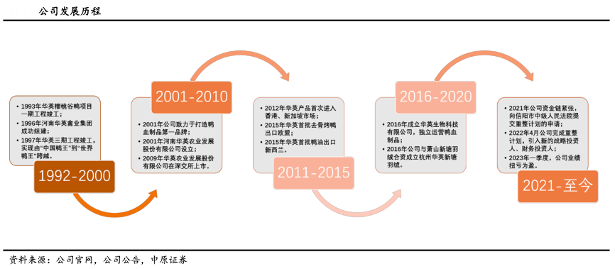 經(jīng)典案例:根據(jù)公司官網(wǎng)、公司公告、中原證券等綜合資訊表明,華英農(nóng)業(yè)公司前身成立于 1991 年,深耕肉禽養(yǎng)殖行業(yè)三十余載,主營(yíng)業(yè)務(wù)包括種鴨養(yǎng)殖、孵化、禽苗銷售、飼料生產(chǎn)、商品鴨屠宰加工、凍品銷售、熟食、羽絨及羽絨制品生產(chǎn)和銷售,2009 年 12 月,公司成功于深交所上市,成為我國(guó)鴨行業(yè)首家上市公 司,也是我國(guó)唯一一家羽絨生產(chǎn)類的 A 股上市公司。