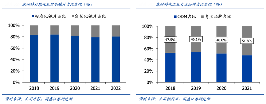 經(jīng)典案例:根據(jù)公司年報(bào)、公司招股書(shū)、國(guó)盛證券研究所等綜合資訊表明,定制化產(chǎn)品主要目標(biāo)是滿(mǎn)足個(gè)性化驗(yàn)光參數(shù)和功能需求,如通過(guò)染色或鍍膜給鏡片添加 偏光、變色、防藍(lán)光、防刮、抗反光及防污等功能。2018-2022年康耐特定制鏡片收入占比從 16.61%上升至 19.59%,短期內(nèi)定制鏡片訂單依舊以客戶(hù)自主填寫(xiě)信息下單為主;同時(shí)高效率運(yùn)輸和物流等服務(wù)持續(xù)賦能,定制化能力突出。