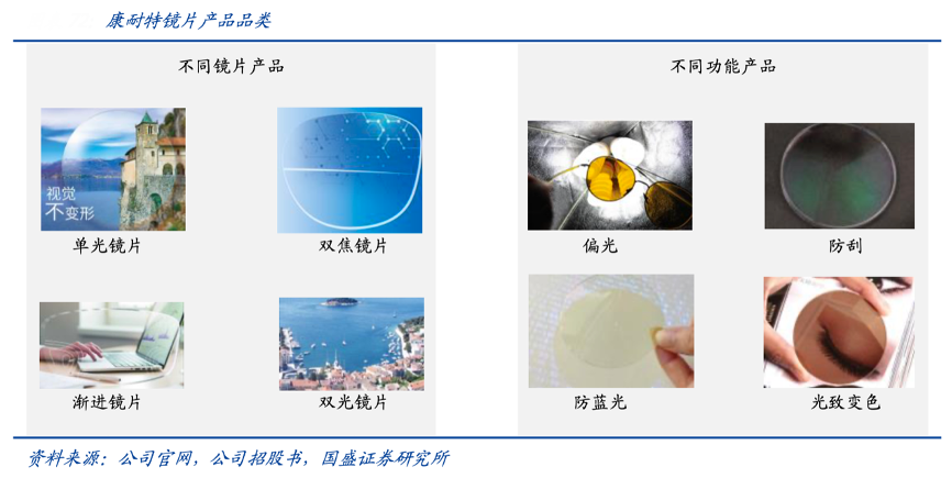 經(jīng)典案例:根據(jù)公司官網(wǎng)、公司招股書、國(guó)盛證券研究所等綜合資訊表明,康耐特產(chǎn)品矩陣豐富,定制化能力突出。自 2018 年日本開放專利以來,康耐特是目前唯一成功引進(jìn)日本 1.74 折射率鏡片生產(chǎn)技術(shù)并批量生產(chǎn)的公司。此 外,公司根據(jù)鏡片設(shè)計(jì),將產(chǎn)品分為平光鏡片、單光鏡片、多焦點(diǎn)鏡片及漸進(jìn)鏡片,能夠覆蓋絕大多數(shù)標(biāo)準(zhǔn)鏡片設(shè)計(jì),SKU 超 600 萬。
