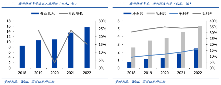 經(jīng)典案例:根據(jù)wind、國(guó)盛證券研究所等綜合資訊表明,康耐特持續(xù)提升自主品牌和定制品占比,伴隨2018-2022 年其定制片業(yè)務(wù)占比從 16.6%上升至 19.6%,同時(shí)2018-2022年公司營(yíng)業(yè)收入從 8.54 億元增長(zhǎng)至 15.61 億元(CAGR 為 16.3%),凈利潤(rùn)從 0.78 億元提升至 2.49 億元(CAGR為 33.4%),凈利率從 9.2%提升至15.9%。