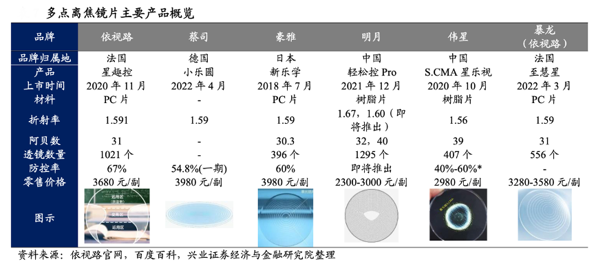 經(jīng)典案例:根據(jù)依視路官網(wǎng)、百度百科、興業(yè)證券經(jīng)濟(jì)與金融研究院等綜合資訊表明,目前,離焦鏡的主要品牌包括外資的依視路、蔡司、豪雅,及國(guó)產(chǎn)的明月、偉星,2021 年中,明月推出一代產(chǎn)品“輕松控”。二代技術(shù)多點(diǎn)離焦鏡片的代表產(chǎn)品是豪雅的新樂(lè)學(xué)及依視路的星趣控,豪雅新樂(lè)學(xué)一經(jīng)推出便受到市場(chǎng)歡迎,明月亦在 2021 年底推出二代產(chǎn)品“輕松控 Pro”。