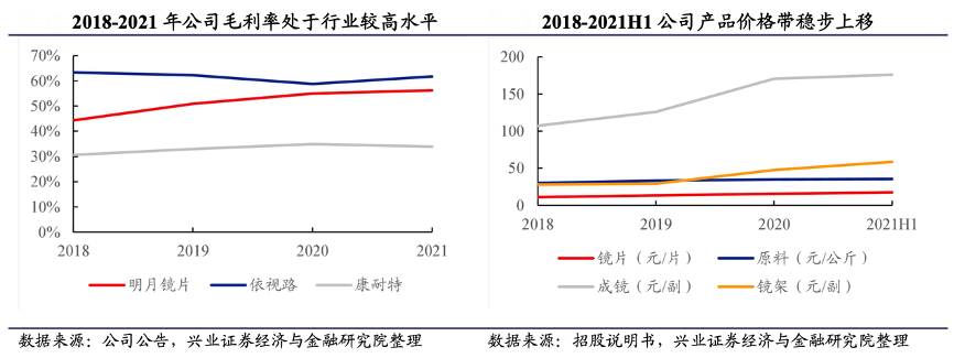 經(jīng)典案例:根據(jù)招股說明書、公司公告、興業(yè)證券經(jīng)濟與金融研究院等綜合資訊表明,明月鏡片公司毛利率穩(wěn)步提升,主要原因有:1)產(chǎn)品結(jié)構(gòu)優(yōu)化(高折射率鏡片、功能片占比提高)疊加品牌影響力提升帶來產(chǎn)品價格帶上移;2)2019 年開始,公司大力發(fā)展電商渠道銷售成鏡產(chǎn)品,隨著規(guī)模效應(yīng)的凸顯,成鏡產(chǎn)品單位成本持續(xù)下降。