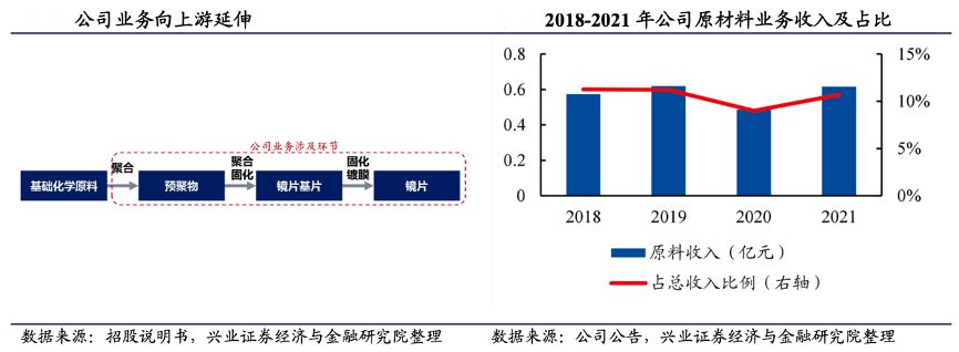 經(jīng)典案例:根據(jù)招股說明書、公司公告、興業(yè)證券經(jīng)濟與金融研究院等綜合資訊表明,明月鏡片自主研發(fā)鏡片原料,打通產(chǎn)業(yè)鏈上游。2006 年,公司與韓國 KOC 合作設(shè)立工廠江 蘇可奧熙,研發(fā)并生產(chǎn)樹脂原料。同時公司與研究機構(gòu)合作,掌握了實驗室制備 1.67 和 1.71 折射率樹脂單體的配方和制備流程。2021 年公司原料業(yè)務(wù) 收入 0.62 億元,占比 10.69%。