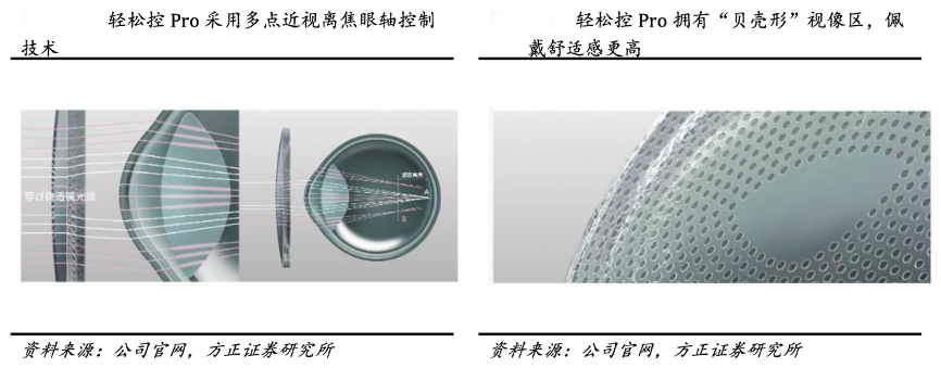 經(jīng)典案例:根據(jù)公司官網(wǎng)、方正證券研究所等綜合資訊表明,2021 年 12 月,明月鏡片公司推出“輕松控Pro”,產(chǎn)品采用多點近視離焦眼軸控制技術,采用繁密的“滿天星”微透鏡排列,增加離焦面積,內部雕刻高達 1295 個正度數(shù)微透鏡,使周邊區(qū)域成像落在視網(wǎng)膜前,從而形 成膜前離焦,進而起到控制眼軸過快增長的作用。輕松控 Pro 同時還 根據(jù)中國孩子“水平視野切換多、上下視野切換少”的用眼習慣,設 計出非對稱貝殼形視像區(qū),提升佩戴舒適感。