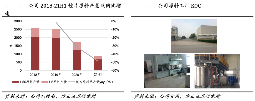 經(jīng)典案例:根據(jù)公司招股書、公司官網(wǎng)、方正證券研究所等綜合資訊表明,明月鏡片公司可自主生產(chǎn)折射率 1.56 及 1.60 系列的樹脂單體自用及對外銷 售,已掌握實驗室制備 1.67 及 1.71 折射率鏡片相關樹脂單體的配方和制備流程,考慮到 1.67 及 1.71 型號高折樹脂單體的生產(chǎn)條件要求嚴格,從經(jīng)濟性角度選擇采購而非自產(chǎn)。根據(jù)招股書披露,2018-21H1 公司鏡片原料總產(chǎn)能分別為 2527 噸、2536 噸、1733 噸、890 噸。