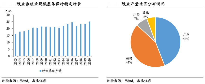 經(jīng)典案例:根據(jù)wind、東北證券等綜合資訊表明,從時間維度來看,2003 年以來我國鰻魚產(chǎn)量總體保持著增長趨勢,借助于投苗節(jié)奏和養(yǎng)殖周期的把控,年產(chǎn)體量維持在 20 萬噸左右,相較于鰻苗捕撈量更加平穩(wěn)。從區(qū)域性來看,鰻魚養(yǎng)殖業(yè)主要分布于沿海城市,其中廣東和福建兩省鰻魚產(chǎn)量合計占我國鰻魚總產(chǎn)量的87%,其中廣東主要養(yǎng)殖日本鰻,而福建近兩年以美洲鰻為主要養(yǎng)殖品種。