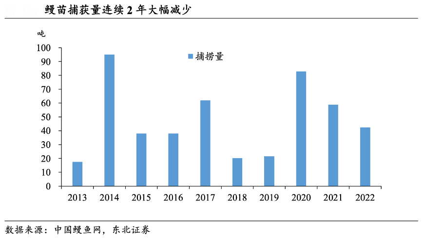 經(jīng)典案例:根據(jù)中國鰻魚網(wǎng)、東北證券等綜合資訊表明,在經(jīng)歷了 2020 年的 大豐收年后,2021-2022 年連續(xù)兩年捕撈季中鰻苗的捕撈量都出現(xiàn)了大幅下滑。2022 鰻苗捕撈季共捕獲鰻苗 42.45 萬噸,同比減少 27.81%。