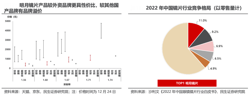 經(jīng)典案例:根據(jù)天貓、京東、沙利文《2022年中國眼鏡片行業(yè)白皮書》、民生證券研究院等綜合資訊表明,在產(chǎn)品力不弱于外資品牌的基礎(chǔ)上,明月鏡片核心產(chǎn)品較外資具備更強(qiáng)性價比,能為消費(fèi)者在有限預(yù)算下提供更優(yōu)選擇。根據(jù)沙利文《2022 年中國眼鏡鏡片行業(yè)白皮書》,2022年,按零售量計(jì)算,明月鏡片以 11%的市占率位列行業(yè)第一。