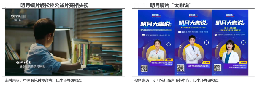 經(jīng)典案例:根據(jù)中國眼鏡科技雜志、明月鏡片商戶服務(wù)中心、民生證券研究院等綜合資訊表明,2023年以來明月鏡片啟動(dòng)“筑夢巔峰進(jìn)百校”校園工藝宣講活動(dòng),攜手清北學(xué)子走進(jìn)校園宣講學(xué)習(xí)方法與近視防控科普知識(shí),活動(dòng)參與度高且精準(zhǔn)面向目標(biāo)用戶人群;此外,明月鏡片還聯(lián)合國內(nèi)眼視光多名權(quán)威醫(yī)生舉辦近視防控研討會(huì),普及近視防控相關(guān)專業(yè)知識(shí)以及輕松控產(chǎn)品解讀,提升輕松控品牌在消費(fèi)者心中專業(yè)認(rèn)知度的同時(shí)也有望提升產(chǎn)品在專業(yè)眼科醫(yī)生中的認(rèn)知度。