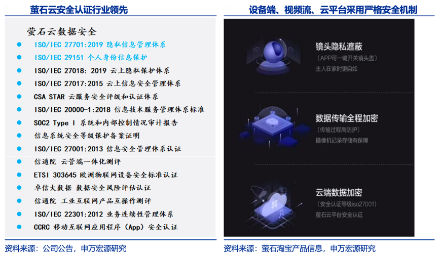 經(jīng)典案例:根據(jù)公司公告、螢石淘寶產(chǎn)品信息、申萬宏源研究等綜合資訊表明,螢石對云安全投入較高,2017年是業(yè)內(nèi)首家通過 ISO27001 安全認(rèn)證的物聯(lián)網(wǎng)云平臺,2021年主動日均安全排查近 360 萬次,公司共拿到 15 項安全認(rèn)證;同時,其自主研發(fā)云安全技術(shù),提供自研輕量級安全傳輸方案和媒體鏈路安全傳輸方案。