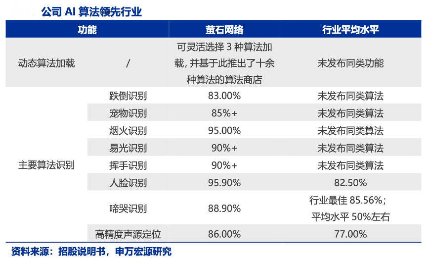 經(jīng)典案例:根據(jù)招股說明書、申萬宏源研究等綜合資訊表明,螢石公司打造算法商店,滿足兒童陪伴、老人看護、寵物陪護等智能家居場景下的剛性監(jiān)測需求。用戶可以根據(jù)應(yīng)用場景的需要自主選擇 AI 算法,以快速定制家居或類家居場景的解決方案,公司在 AI 算法上領(lǐng)先行業(yè)平均水平。