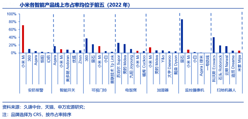 經(jīng)典案例:根據(jù)小米商城、申萬宏源研究等綜合資訊表明,結合IDC 智能家居數(shù)據(jù),2022Q1 小米智能家居出貨量市場份額達到 18%,遠超其他企業(yè)。截至 2022 年 12 月,小米共投資 420 家企業(yè),綠米、云米、石頭科技等均為具有代表性的智能家居生態(tài)鏈企業(yè);AIoT 連接設備數(shù)達到 5.89 億,同比 +35.8%,米家 APP 的月活躍用戶數(shù)同比+18.6%至 7580 萬,在我國乃至全球市場均處于 領先地位。