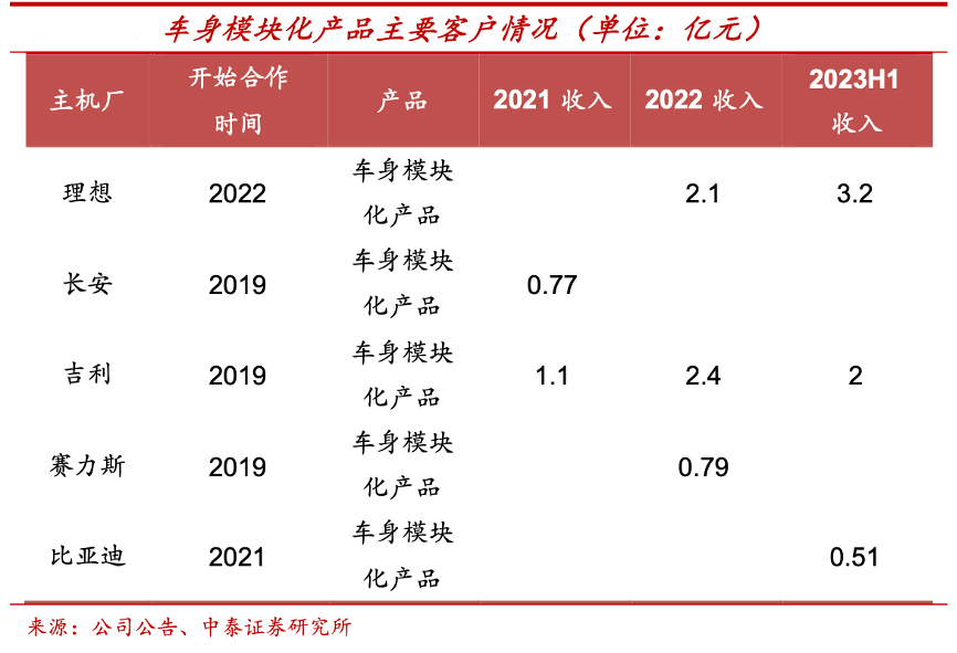 經(jīng)典案例:根據(jù)公司公告、中泰證券研究所等綜合資訊表明,博俊科技公司從 2018 年起積極拓展車身模塊化業(yè)務(wù),熟練掌握沖壓、熱成型、 焊接、激光焊接、注塑、裝配等工藝,并于 2019 年期借助車身模塊化產(chǎn)品升級為 Tier1,相繼與吉利、長安、賽力斯、比 亞迪、理想等頭部新勢力&自主建立合作。