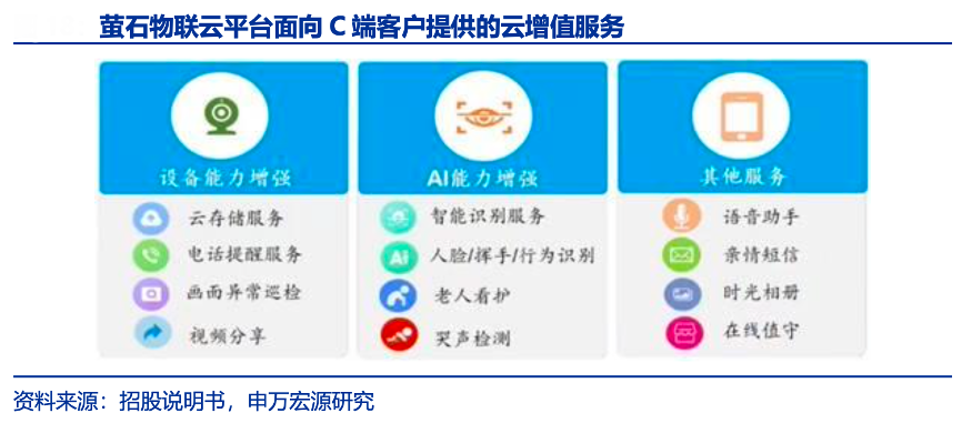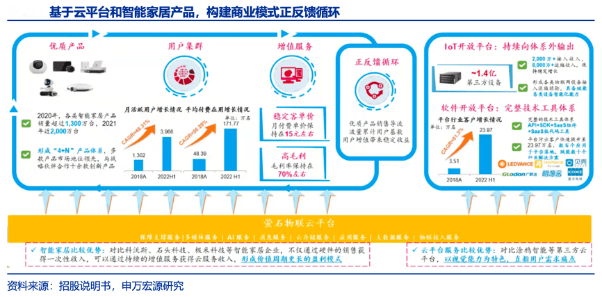 經(jīng)典案例:根據(jù)招股說(shuō)明書(shū)、申萬(wàn)宏源研究等綜合資訊表明,螢石基于強(qiáng)大的云平臺(tái)能力,形成“優(yōu)質(zhì)產(chǎn)品引流——積累用戶基數(shù)——增值服務(wù)帶來(lái)高毛利”的商業(yè)模式,構(gòu)成正反饋循環(huán)。對(duì)比其他競(jìng)爭(zhēng)對(duì)手,形成價(jià)值周期更長(zhǎng)的盈利模式;以視覺(jué)能力為特色,滿足用戶多元化需求,具備獨(dú)特優(yōu)勢(shì)。