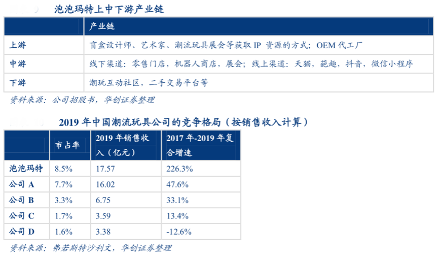 經(jīng)典案例:泡泡瑪特是潮玩行業(yè)中打通潮玩全產(chǎn)業(yè)鏈的優(yōu)秀企業(yè),根據(jù)弗若斯特沙利文、華創(chuàng)證券等綜合資訊顯示,其從潮玩品牌IP打造和運營)、OEM生產(chǎn)、線上線下渠道銷售、潮玩社區(qū)搭建(葩趣 APP)及潮流玩具文化推廣(大型潮玩展會)進行了“潮玩全產(chǎn)業(yè)鏈”覆蓋。其核心競爭力來源于品牌IP資源,潮玩IP的獲取方式包括藝術(shù)家原創(chuàng)或者由電影、動漫、游戲或者其他內(nèi)容授權(quán)而得。